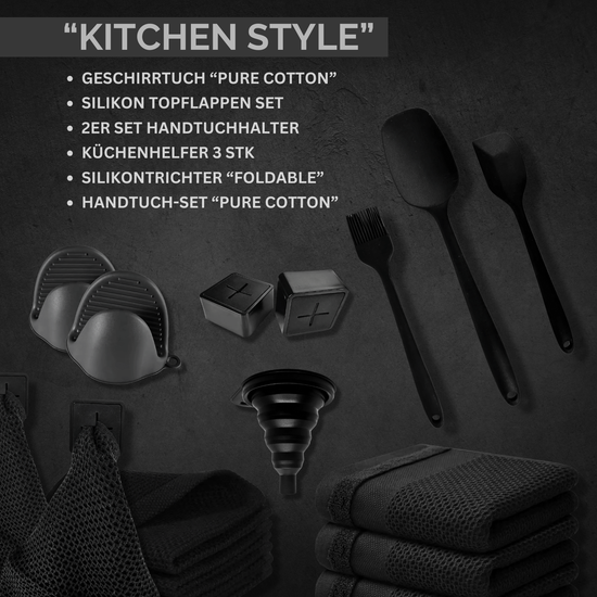 Ob du Hobbykoch oder Profi am Herd bist – dieses exklusive Küchen-Bundle verleiht deinem Küchenalltag nicht nur Stil, sondern auch Funktionalität. Alles in tiefem Schwarz gehalten, fügt sich jedes Teil elegant in moderne Küchen ein. Hochwertige Materialien, durchdachtes Design und echte Alltagstauglichkeit machen dieses Set zum perfekten Geschenk für dich selbst oder deine Liebsten.