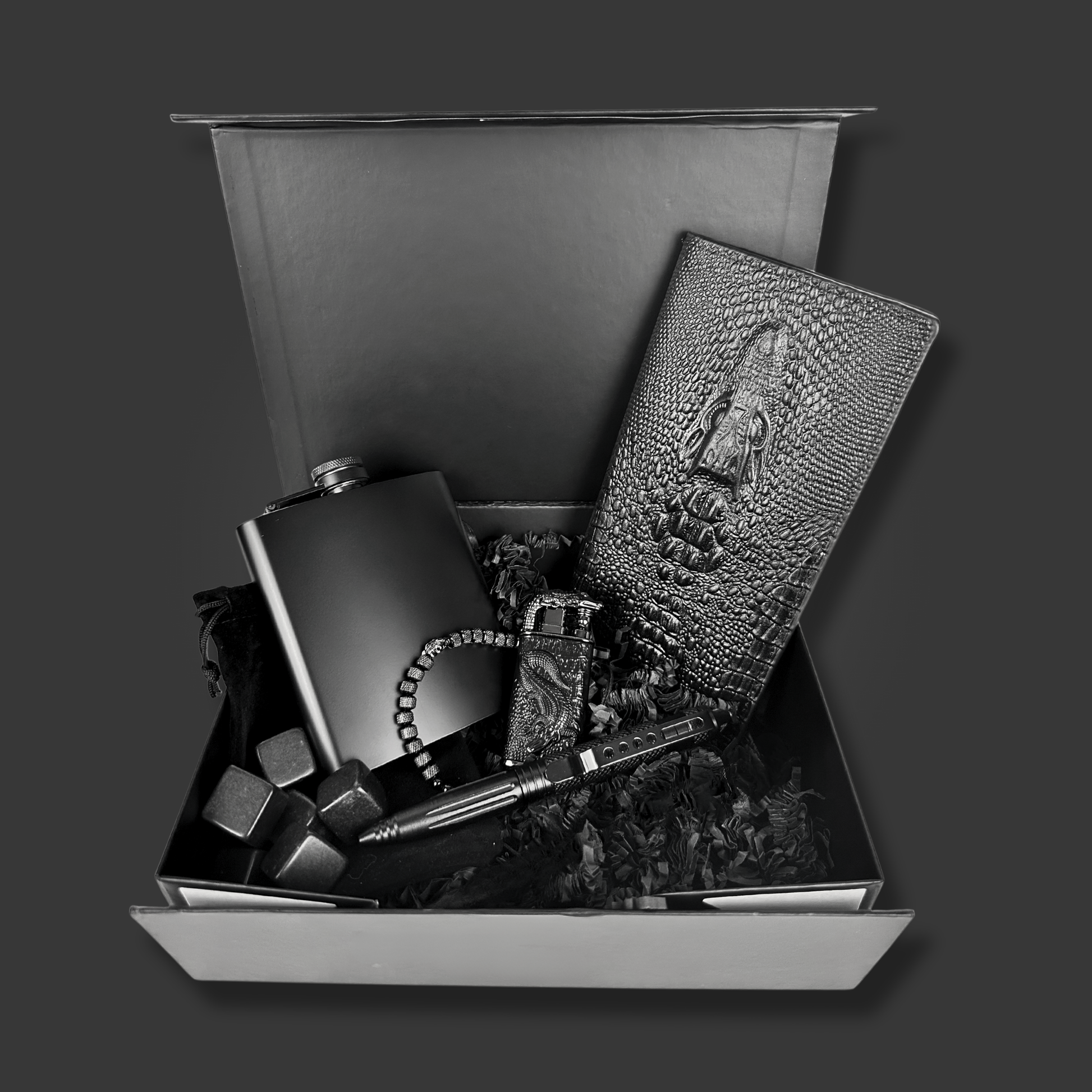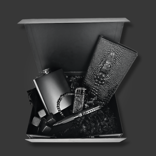 Diese edle Geschenkbox kombiniert hochwertige Accessoires mit einem Hauch von Extravaganz – von einem kroko-geprägten Portemonnaie bis hin zu einem schwarzen Flachmann, der pure Klasse ausstrahlt. Mit den Whiskey-Steinen "Obsidian" genießt du dein Getränk stilvoll, während das Armband "Tiger" und das Feuerzeug "Dragonflame" deinem Look einen markanten Touch verleihen. Ergänzt wird das Set durch einen Multi-Kugelschreiber – ein Must-Have für jeden Mann mit Stil.