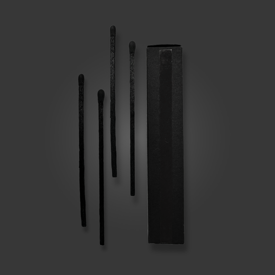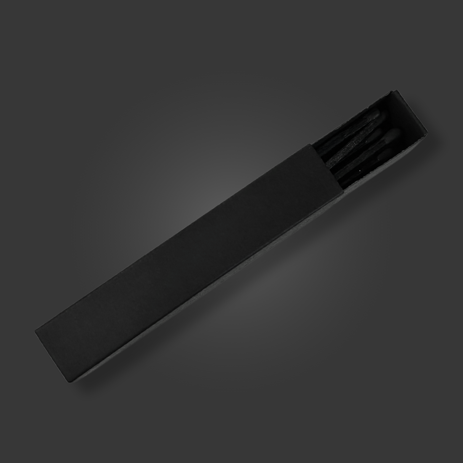 Edle Streichholzbox aus Karton mit hochwertigen, schwarzen Holzstreichhölzern.