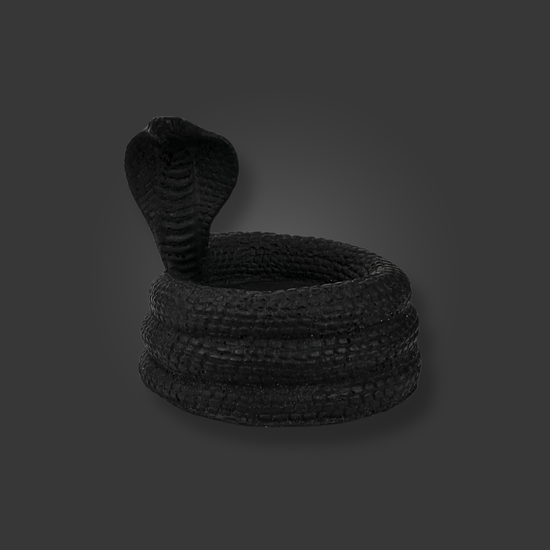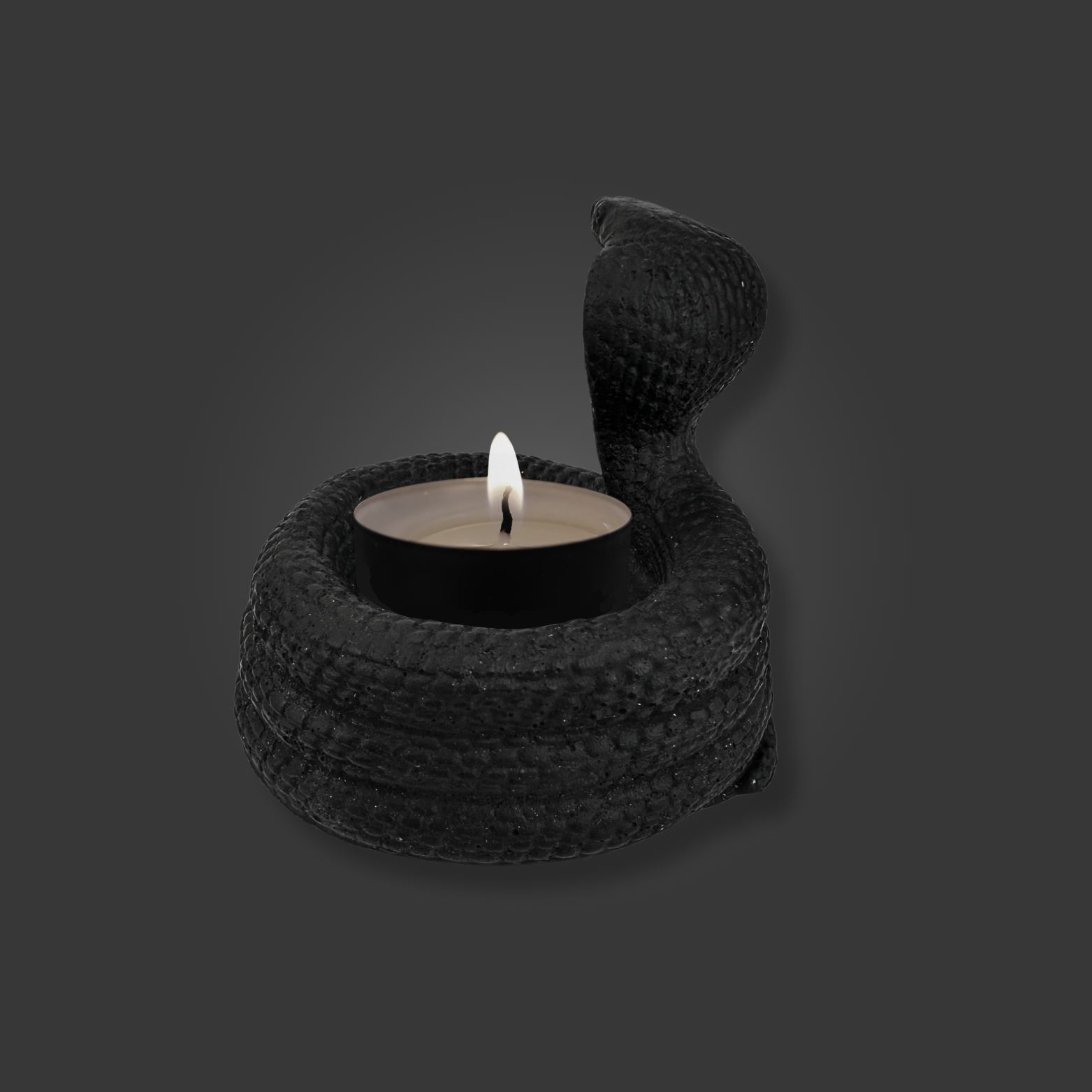Mit seiner mattschwarzen Oberfläche und der detailreichen Textur zieht der Teelichthalter alle Blicke auf sich. Das Teelicht ruht sicher im geschwungenen Körper der Schlange, während die aufgerichtete Kobra-Kapuze die Flamme in Szene setzt.